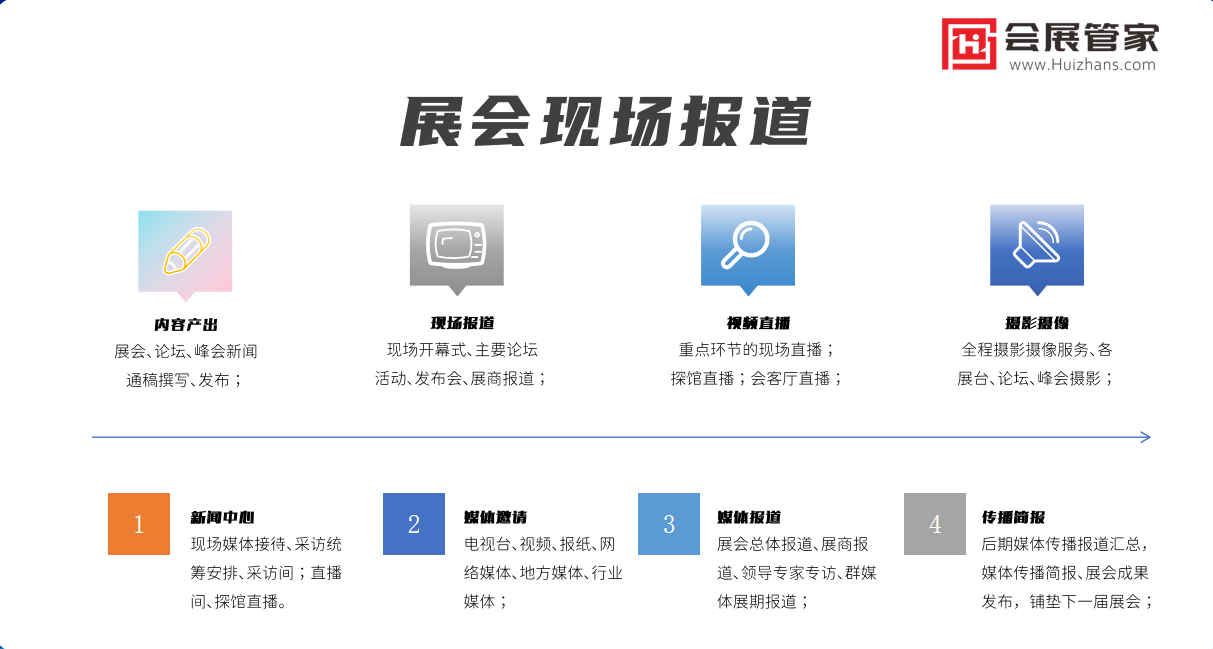 “会展管家——国内专业会展行业媒体服务商,会展管家主要给展会主办方、会议主办方、品牌参展企业提供媒体邀约、媒体采访、媒体发稿服务,给客户提供权威的媒体服务,会展管家建立了涵盖全国几乎所有一手媒体资源,包含官方媒体、各大门户网站、视频媒体、垂直行业媒体、自媒体、视频直播、图文直播等等,目前已经服务了200多个品牌展会论坛主办方,1500余家大型品牌企业,拥有专业的全案媒体服务经验。
