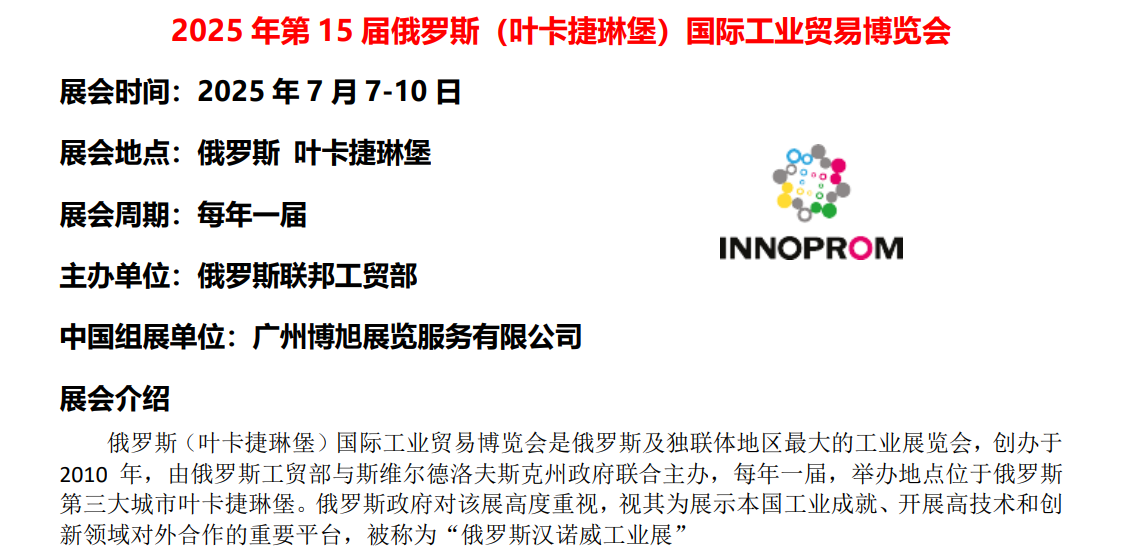 俄罗斯(叶卡捷琳堡)国际工业贸易博览会是俄罗斯及独联体地区最大的工业展览会,创办于2010年,由俄罗斯工贸部与斯维尔德洛夫斯克州政府联合主办,每年一届,举办地点位于俄罗斯第三大城市叶卡捷琳堡。俄罗斯政府对该展高度重视,视其为展示本国工业成就、开展高技术和创新领域对外合作的重要平台,被称为“俄罗斯汉诺威工业展” 在当今全球化的经济环境中,没有任何一件工业产品能够独立于众多企业的协作之外诞生。这一过程涉及多方面的专业人士,包括工程师、设计师、制造商、消费者、物流专家以及各类顾问等,他们共同构建了一个高度互联且不断进化的智能生态系统。这个系统的核心目标在于持续的自我革新与成长。俄罗斯每年举办的大型工业展览会,它不仅展示了不同行业和地区间合作的丰硕成果,同时也为参与企业开辟了广阔的商业网络和合作机遇,极大地促进了行业间的交流与创新。