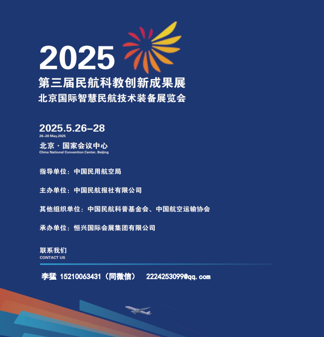 “第三届民航科教创新成果展”北京国际智慧民航技术装备展览会是集中展示我国民航领域科技创新成果的大型展览展示会,是民航系统举办的规模最大的专业展览,是全社会了解民航发展的重要窗口,是民航系统贯彻新发展理念、推进高质量发展、实现民航强国战略的重要展示平台。第三届北京国际智慧民航技术装备展览会将于2025年5月26日-28日在北京国家会议中心隆重举办,展览面积规划40000平方米,预计350家企业参展
